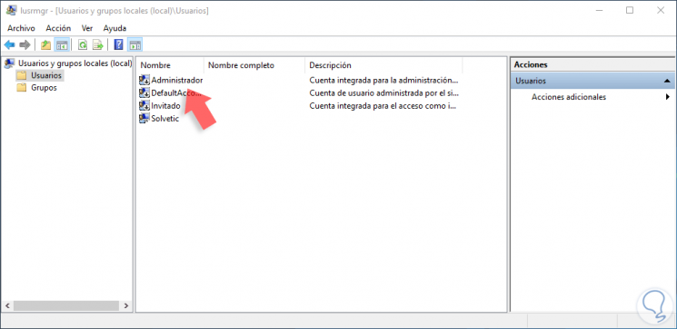 Se desplegará la siguiente ventana donde seleccionamos la carpeta Usuarios y podemos ver que el usuario Administrador se encuentra deshabilitado por defecto.